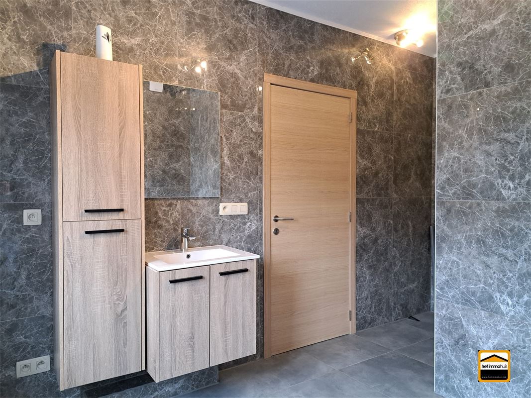 In de badkamer is er een zeer ruime inloopdouche voorzien alsook een enkele lavabo met meubel,