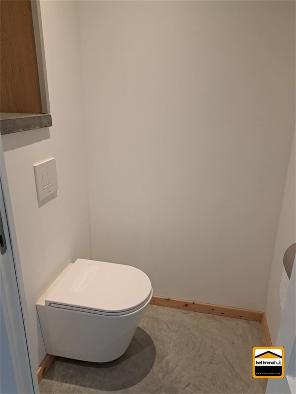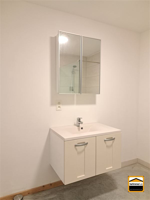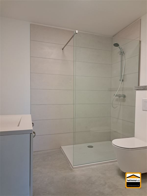 In de badkamer is er een enkele lavabo met meubel, een inloopdouche en een toilet aanwezig.